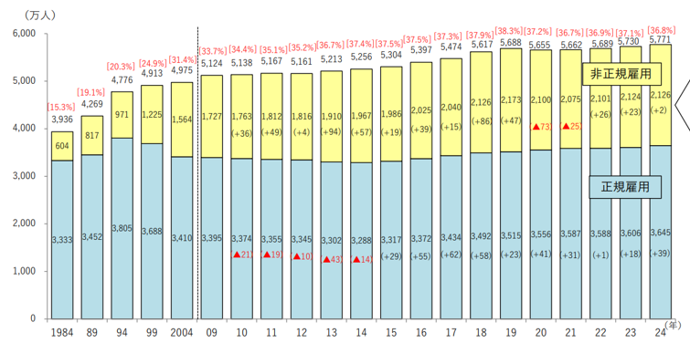 厚生労働省の調査によると、非正規雇用労働者の数は2015年に8年ぶりにプラスに転じ、10年連続で増加しているとわかりました。特に2022年以降は増加の一途を辿っており、正社員と比べて待遇が低いことが問題視されるようになっています。