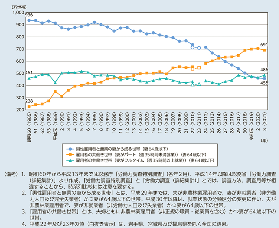 現行制度が前提としてきた「専業主婦世帯」は2021年で458万世帯、妻がフルタイムで働く「共働き世帯」は486万世帯と、フルタイム共働き世帯が専業主婦世帯を上回っています。